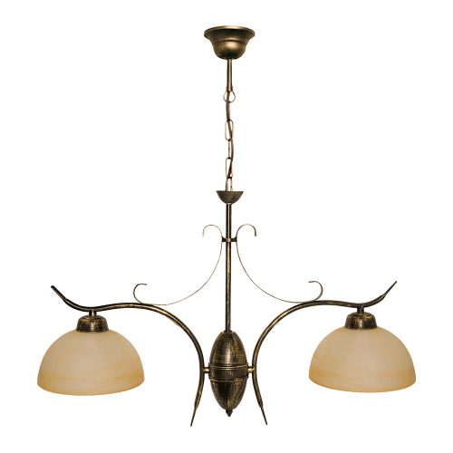 Моделът съчетава метална конструкция с елегантни извивки и стъклени абажури, които придават на осветителното тяло изискан и балансиран вид. Фините линии и симетричната композиция подчертават класическия характер на полилея и го превръщат в елегантен акцент в интериора. Стъклените абажури разсейват светлината меко и равномерно, създавайки приятна атмосфера в помещението.