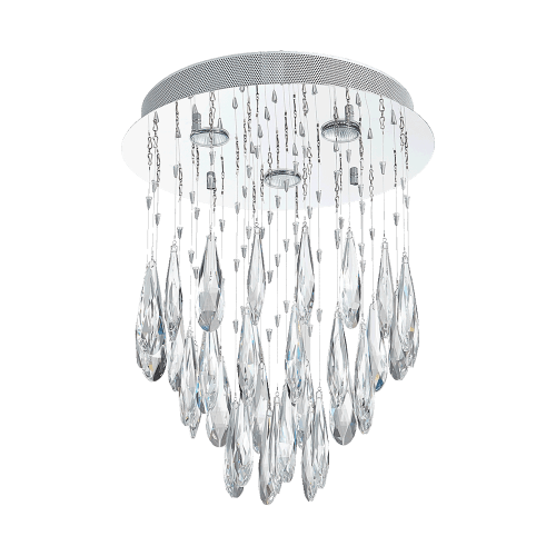 Светлина и функционалност Трите фасунги GU10 (по 50W, крушки не са включени в комплекта) осигуряват топло и уютно осветление, допълнително обогатено от пречупването в кристалните капки. Препоръчваме LED крушки GU10 за оптимална енергийна ефективност и по-дълъг живот на осветлението.